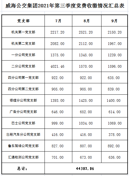 威海公交集團(tuán)各黨支部2021年第三季度黨費(fèi)收繳情況匯總表