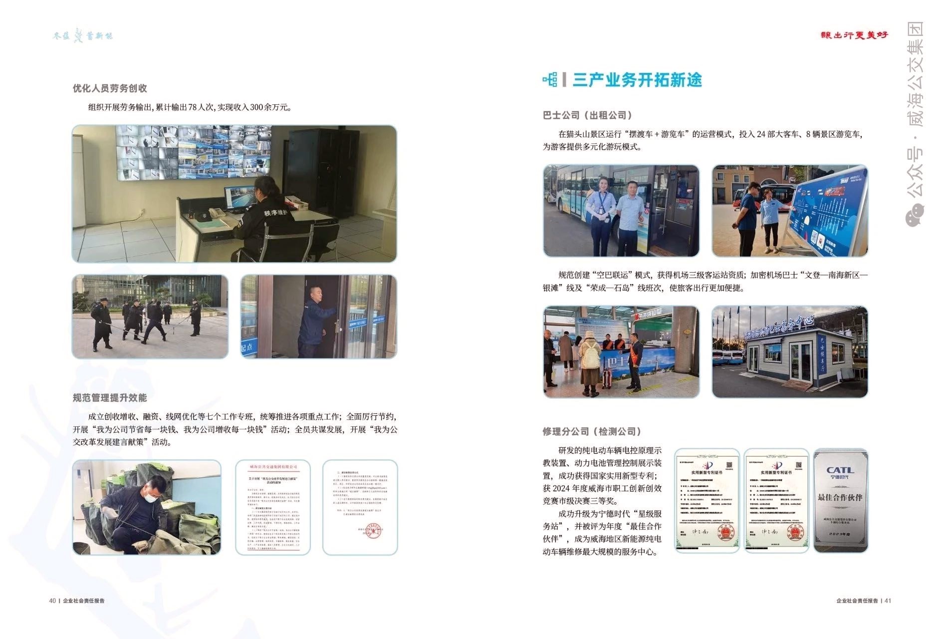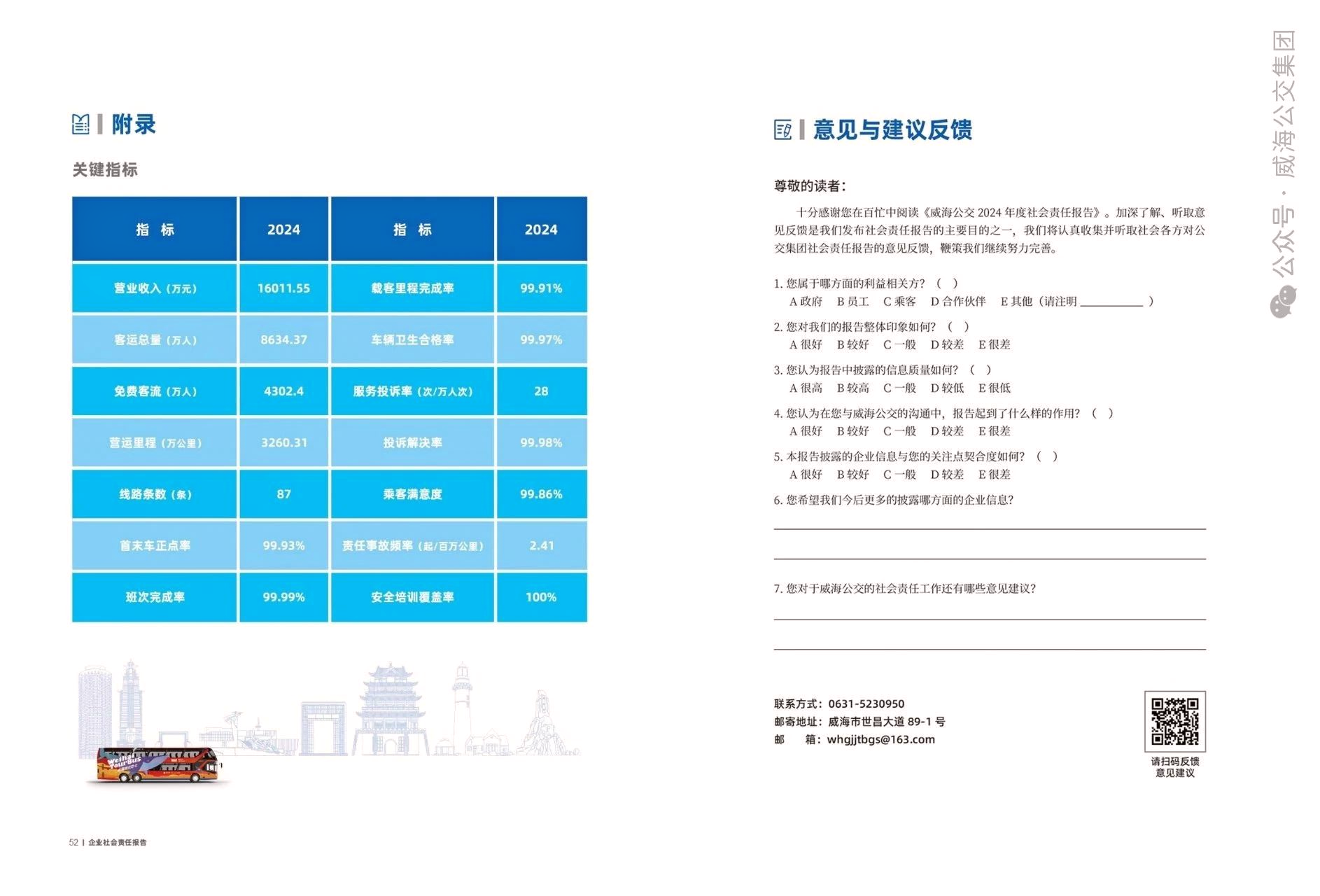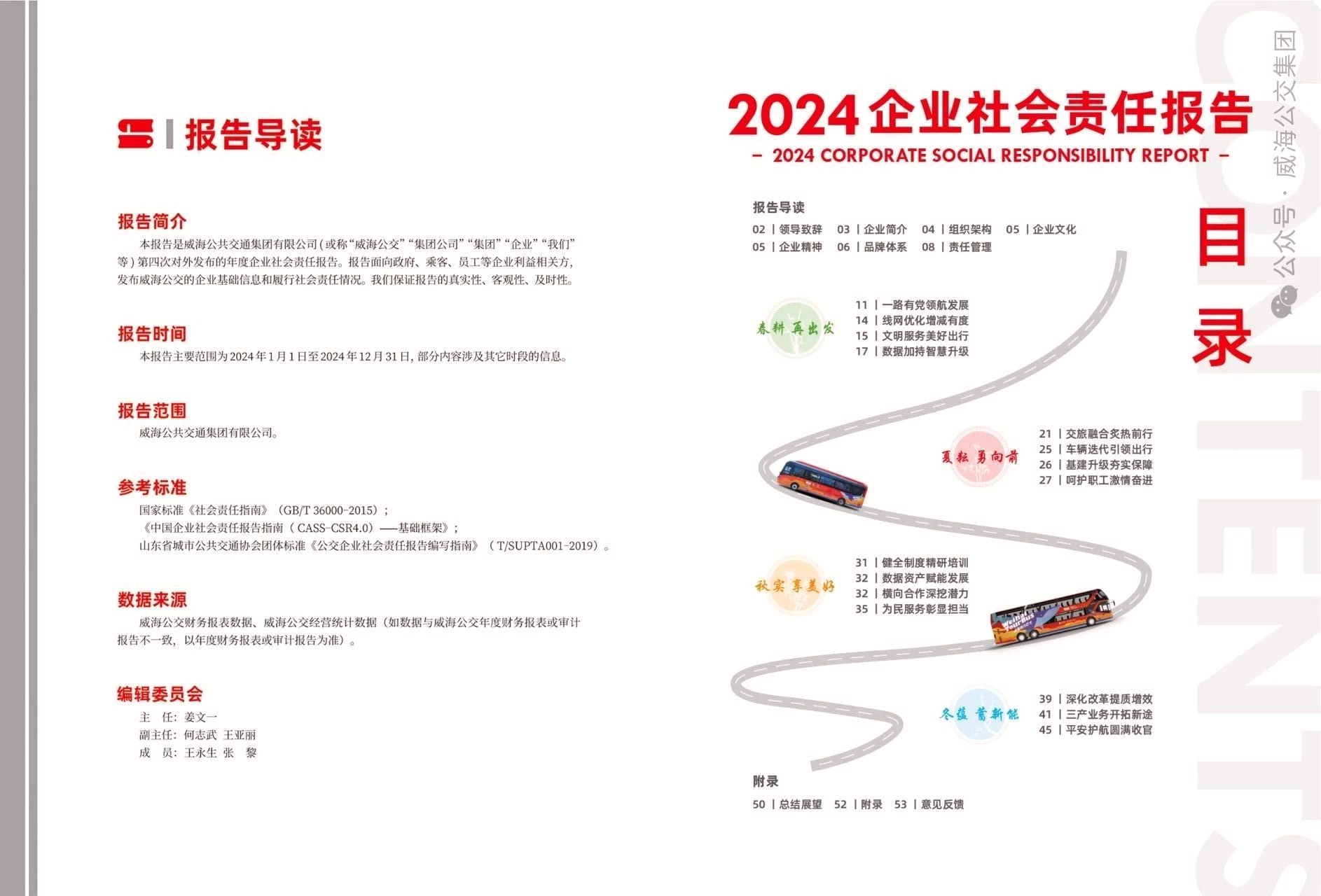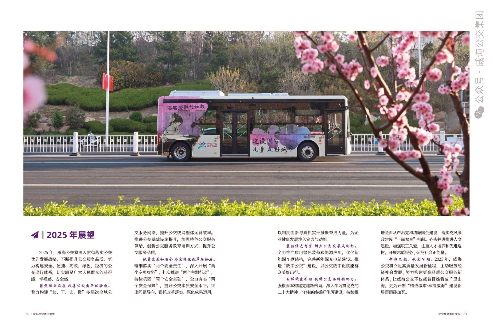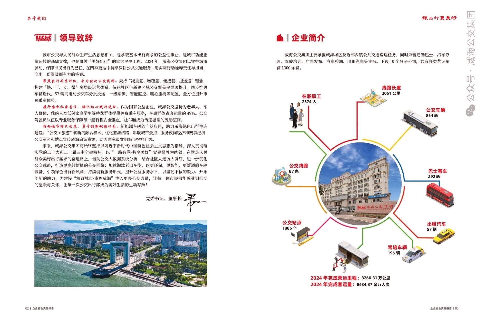 《威海公交集團(tuán)2024年度社會(huì)責(zé)任報(bào)告》(以下簡(jiǎn)稱《報(bào)告》)正式發(fā)布。2024年,威海公交集團(tuán)堅(jiān)持以習(xí)近平新時(shí)代中國(guó)特色社會(huì)主義思想為指導(dǎo),深入貫徹落實(shí)黨的二十大和二十屆三中全會(huì)精神,以“一路有黨·共享美好”黨建品牌為統(tǒng)領(lǐng),在四季更迭中,持續(xù)深化公共交通服務(wù),生動(dòng)踐行責(zé)任與擔(dān)當(dāng),呈上一份溫暖且有力的成績(jī)單。這是威海公交集團(tuán)連續(xù)第四年向外界發(fā)布企業(yè)年度社會(huì)責(zé)任報(bào)告。《報(bào)告》以“春耕”“夏耘”“秋實(shí)”“冬蘊(yùn)”四個(gè)篇章,從多個(gè)維度、全方位呈現(xiàn)了威海公交保障城市交通順暢、方便市民出行,與百姓生活緊密相連的實(shí)際行動(dòng)?!秷?bào)告》將通過企業(yè)官網(wǎng)、微信公眾號(hào)等平臺(tái)向社會(huì)公開,主動(dòng)接受社會(huì)各界的監(jiān)督與評(píng)價(jià),以此為契機(jī),期望獲得社會(huì)公眾更多的關(guān)注、理解與支持。