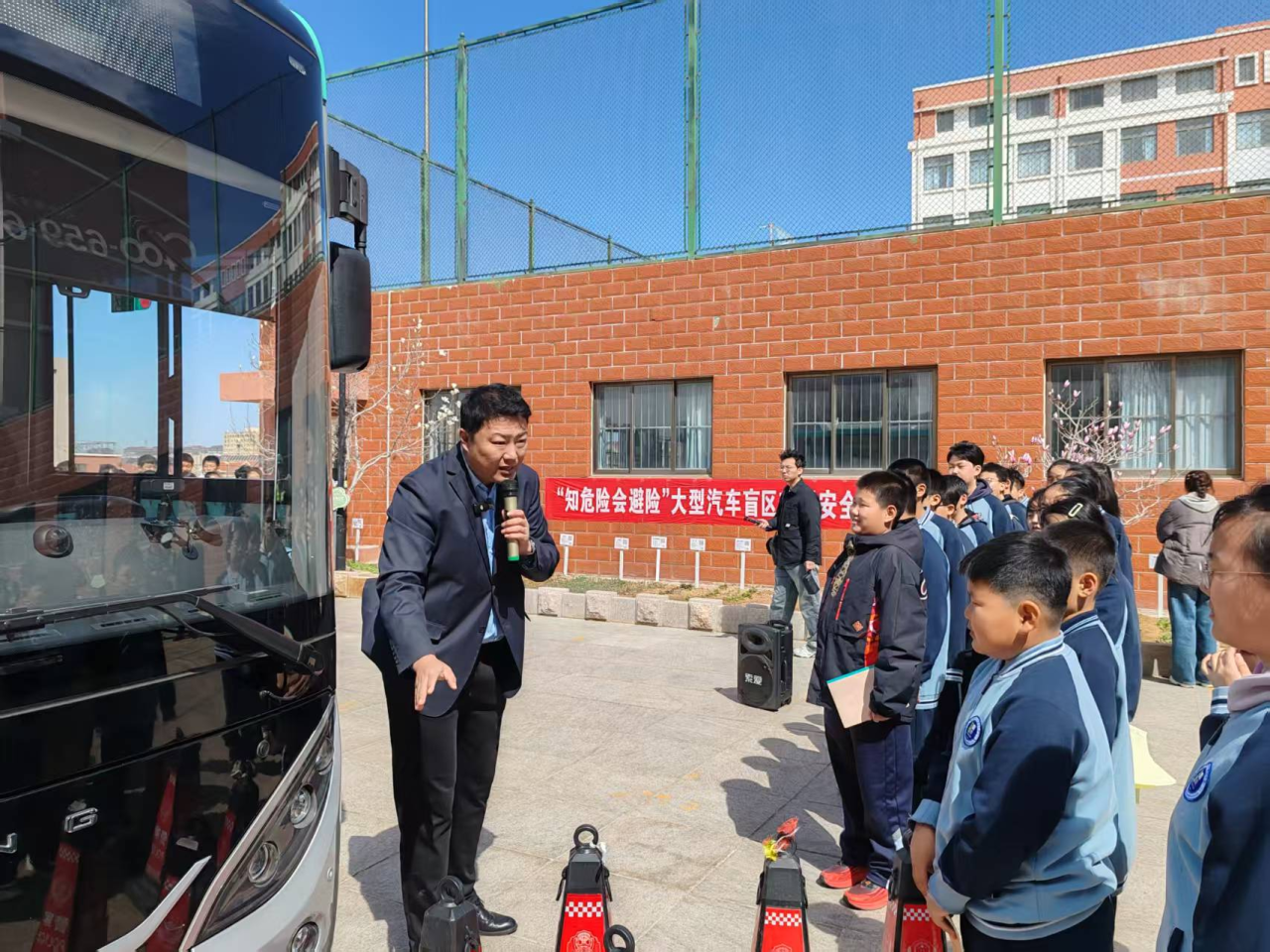 活動現(xiàn)場,環(huán)翠區(qū)分公司營運服務科工作人員和交通民警就中小學生安全乘車注意事項、遇到公交車等大型車輛時如何規(guī)避事故風險、公交車盲區(qū)位置等方面做了詳盡細致地講解,并通過擺放反光錐與真人演示等方式,向同學們直觀展示盲區(qū)的分布情況。
